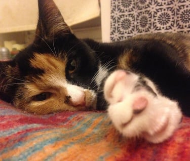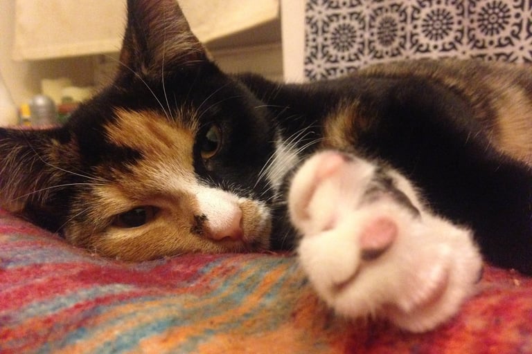 Here is another example of an obscured face due to lying down. It's especially hard with cats to get a good image of them sat up, but from this pose, I could be missing crucial markings (even though this is a very sweet picture) :)